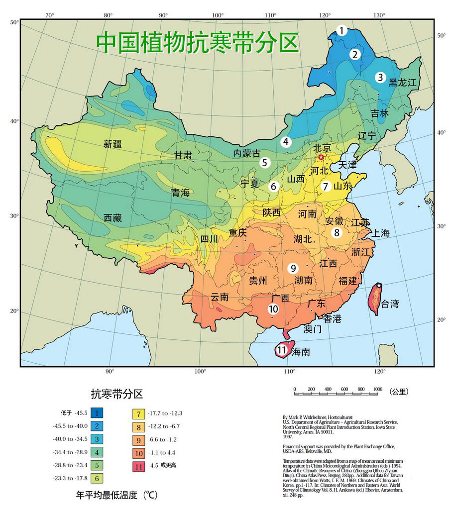 原品種作為雞爪槭的變種,可適應(yīng)最低-20℃的低溫,種植范圍廣,北至京津冀,南至湖北、四川、貴州等地(如圖7區(qū)﹣9區(qū))。其冬季雖然落葉,但枝條亦能呈現(xiàn)紅色,所以,金禧非常適合在黃河以北,例如說(shuō)北京,作為城市色塊產(chǎn)品的補(bǔ)充,為北方單調(diào)的色塊增彩添色。